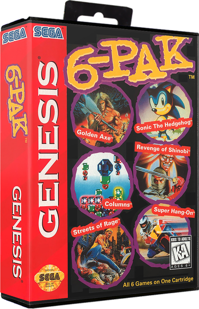 Grab the 6-pak that'll quench your thirst for gaming! SONIC THE HEDGEHOG: This is it! The original that started it all! GOLDEN AXE: Ride a flame-spitting monster to victory! Three characters, each with special magic and weapons, battle to save the kingdom! COLUMNS: The brilliant puzzle game that will challenge your mind, not just your trigger finger! SUPER HANG-ON: Red-line your bike and blow away the competition! There's no better thrill than the roar of your pipes as you leave another rider behind, except maybe customizing your bike into an unbeatable racing machine! REVENGE OF SHINOBI: Use deadly ninja attacks to defeat the evil Neo Zeed army! If you fail, their beautiful prisoner dies! STREETS OF RAGE: The ultimate in street combat! Three characters, 40 moves, and a relentless onslaught of weapon-wielding thugs!