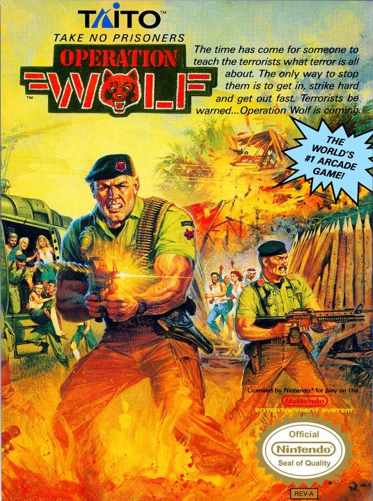 A group of desperate terrorists is keeping hostages in their jungle fortress. As a member of the elite tactical squad Operation Wolf, you must invade their hideout, destroy their operations, and get the hostages out alive! Maneuver through a series of missions and fight off soldiers, patrol boats, helicopters, and more.